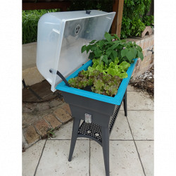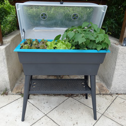 La croissance de vos plantes passe par un arrosage suffisant : cette jardinière de couleur grise et turquoise dispose d’une gestion autonome de l’eau grâce à un arrosage latéral avec contrôle du niveau de l’eau et système de trop plein. Pratique, elle dispose d’une tablette de rangement pour déposer vos outils.