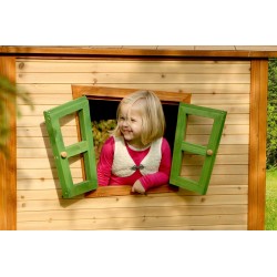 La maisonnette bois JESSE dispose d’une pièce à vivre de 1.40 m² avec 1 porte et 3 fenêtres plexiglass toutes avec une fermeture aimantée ainsi qu’une petite terrasse de 0.71 m². Légèrement surélevée pour éviter l’humidité, elle est déjà lasurée avec une lasure à bas d’eau non-toxique pour les enfants. Le sol est également en cèdre légèrement surélevé afin de ne pas abimer la pelouse et d’éviter l’humidité.
