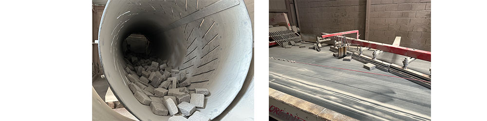 Les pavés, qui ont séché, sont déposés dans une machine en forme de tube qui va les mélanger. En tournant, ce tambour permet au pavé de s’entrechoquer. Ainsi les arrêtes se polissent et les pavés acquiert une finition vieillie.